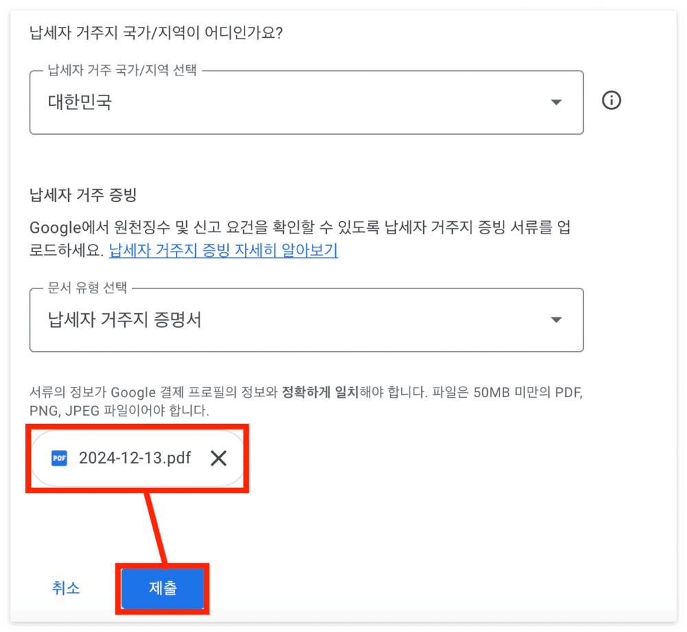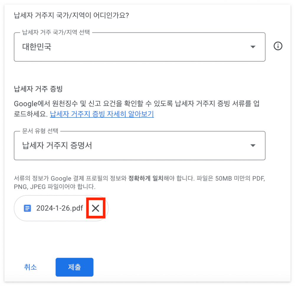납세자 거주지 국가 및 문서 유형은 기존에 선택했던 대로 자동으로 선택되어 있으니 변경사항이 없다면 건드리지 마시고, 아래에 기존에 제출했던 파일을 X표시를 눌러 삭제해 주세요. 이후 같은 자리에 새로 받은 납세자 거주지 증명서를 업로드한 뒤 [제출] 버튼을 클릭해 주세요.