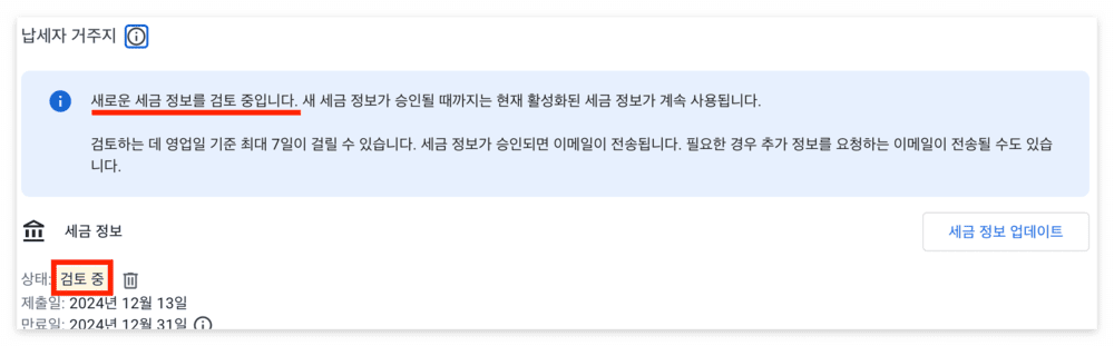 구글 애드센스 | 납세자 거주지 세금 정보 업데이트 방법