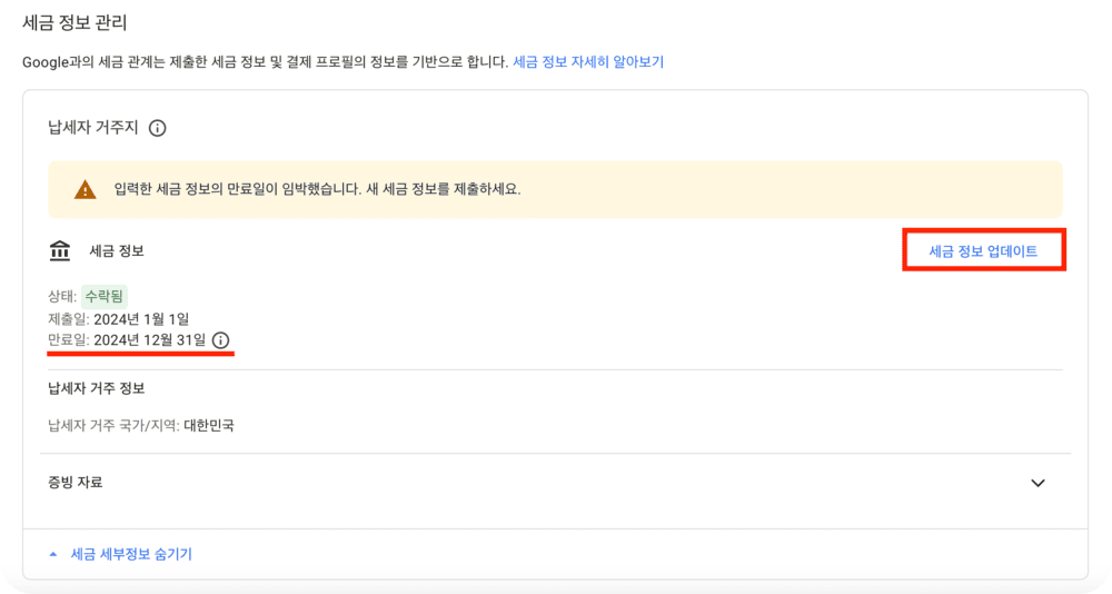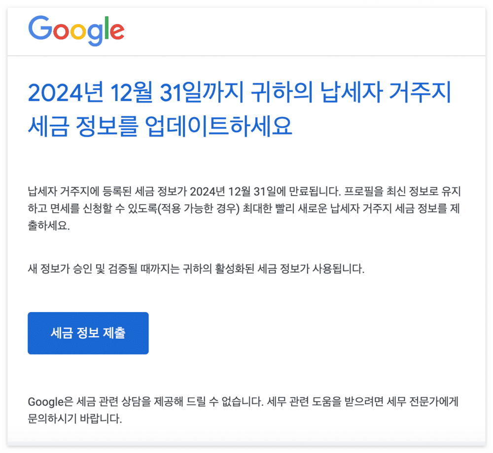 저도 하기 전까지는 세금 관련된 사항이다 보니 복잡할 것만 같아 미뤄왔지만 막상 해보니 생각보다 간단하고 쉽게 해결할 수 있었습니다. 다만 새로 제출한 서류 또한 만료일이 12월 31일이라 2025년이 되면 또다시 제출해야 하나 하는 의문이 있지만, 구글에서 날아온 메일에 의하면 2024년 12월 31일까지 업데이트하라고 하니 일단은 업데이트했습니다.