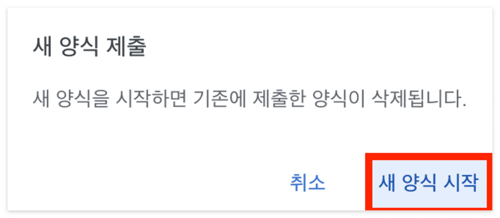 '새 양식 제출'에 대한 알림이 뜨는데 [새 양식 시작]을 눌러줍니다. 저도 처음에 기존에 제출한 양식이 삭제된다고 해서 '내가 적었던 정보가 다 사라지는 건가?' 하는 생각에 선뜻 새 양식 시작을 누르지 못하고 찾아봤었는데요, 사실 내용상으로 새로 기입할 건 없고 증명서 이미지만 교체하면 되기 때문에 겁을 먹지 않으셔도 됩니다.
