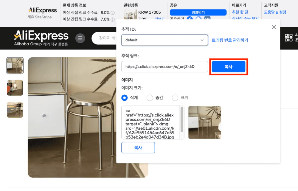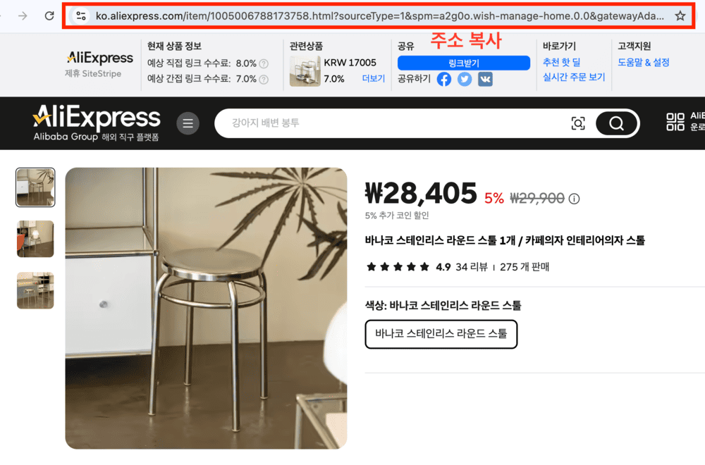 알리 어필리에이트 페이지를 통해서 상품 링크를 공유하려면 먼저 알리익스프레스에서 공유하려는 상품 페이지의 주소를 복사해 주세요.