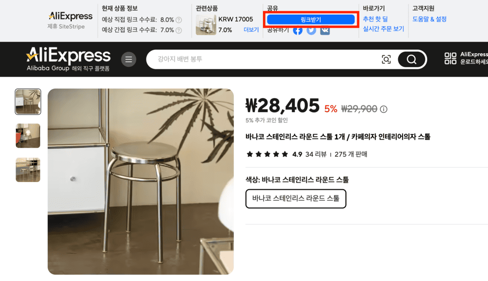 알리 어필리에이트에 가입 승인이 완료되었다면, 알리익스프레스 홈페이지에 접속했을 때 아래 이미지와 같이 상단바가 하나 생기는데요. 자세히 보시면 상품의 예상 수수료와 공유 링크받기 버튼이 활성화되어 있는 것을 보실 수 있습니다. [링크받기] 버튼을 클릭해 주세요.